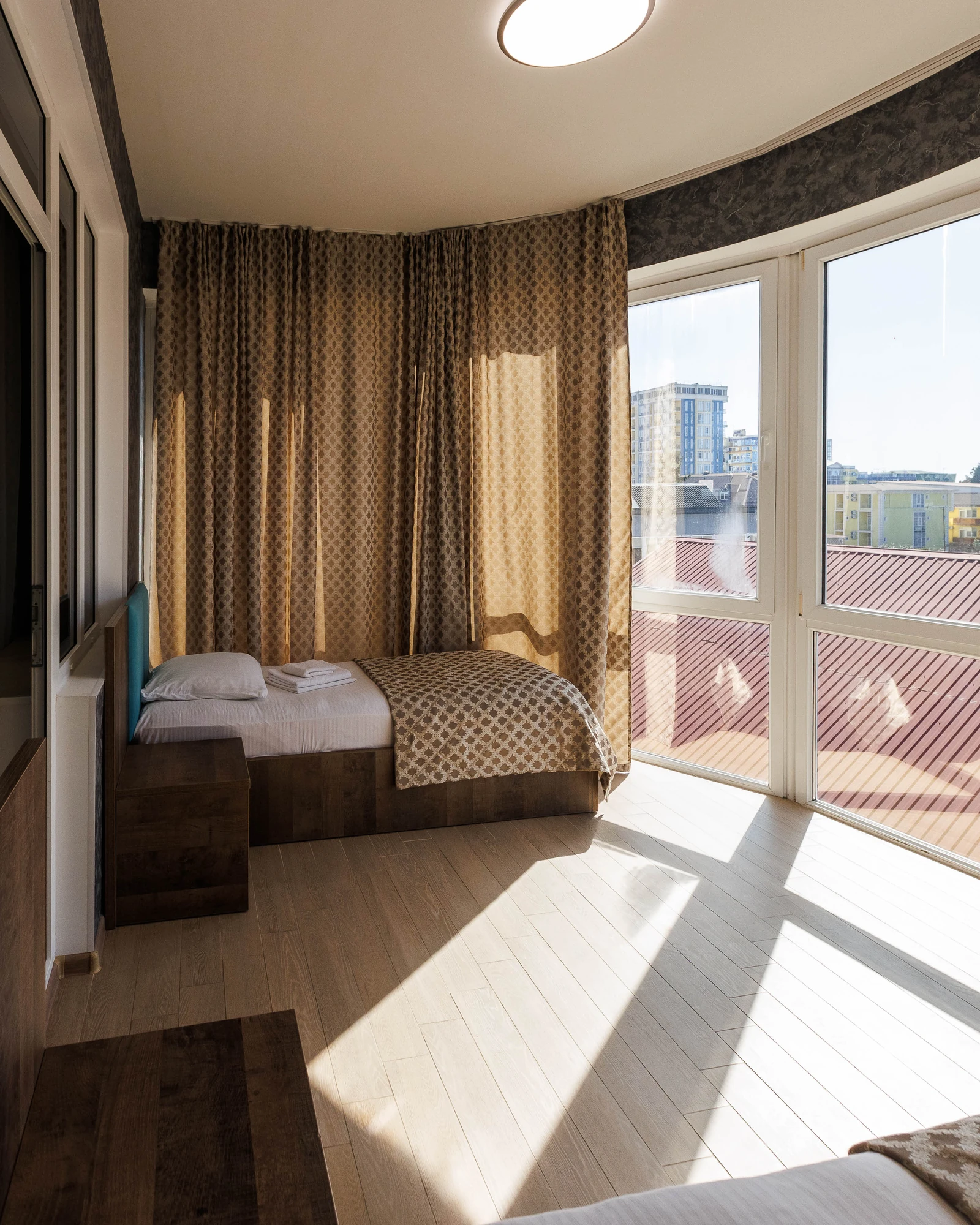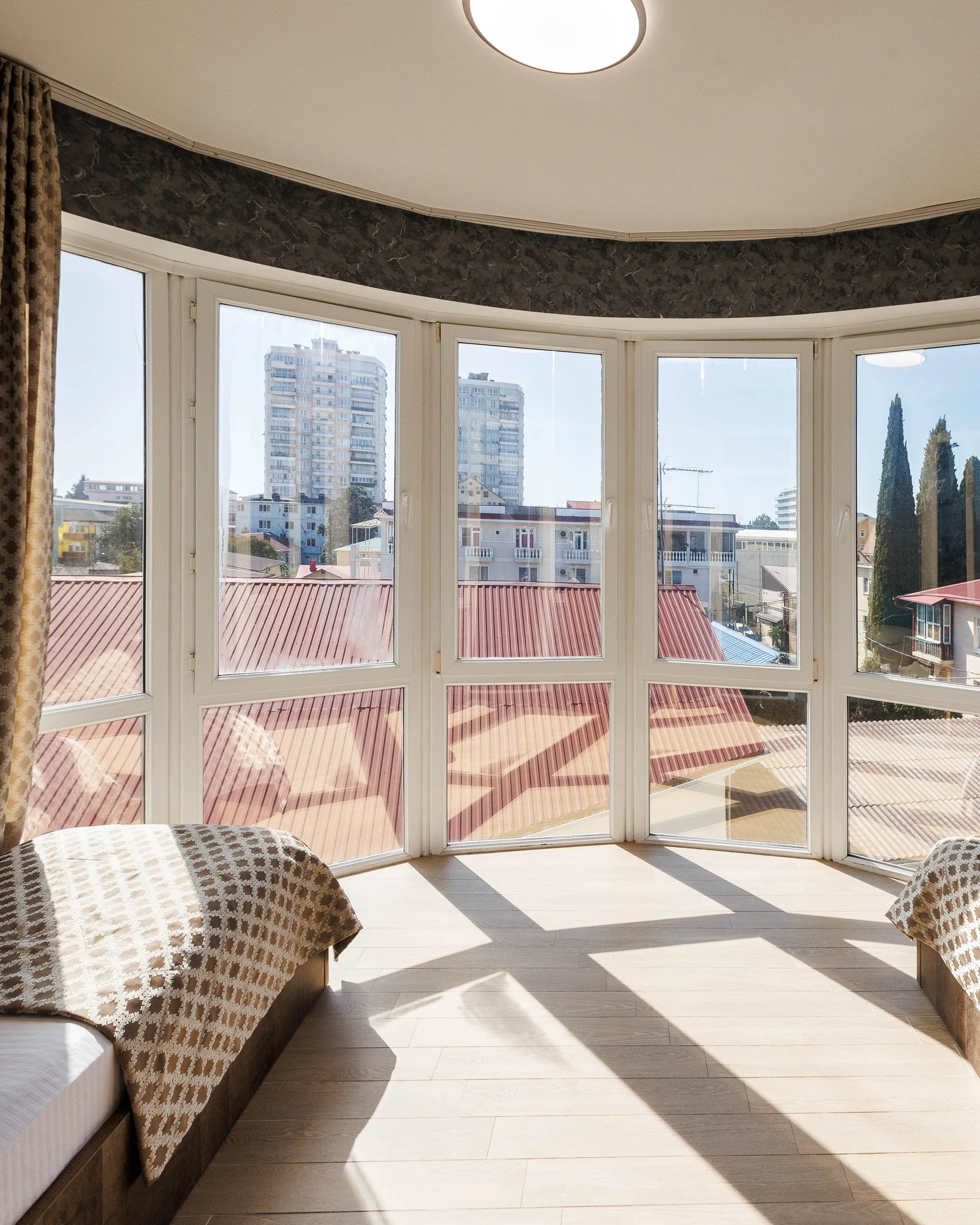 В номерах данной категории имеется просторный эркер с витражными окнами, который наполнен солнцем и светом.Раздельные спальные места